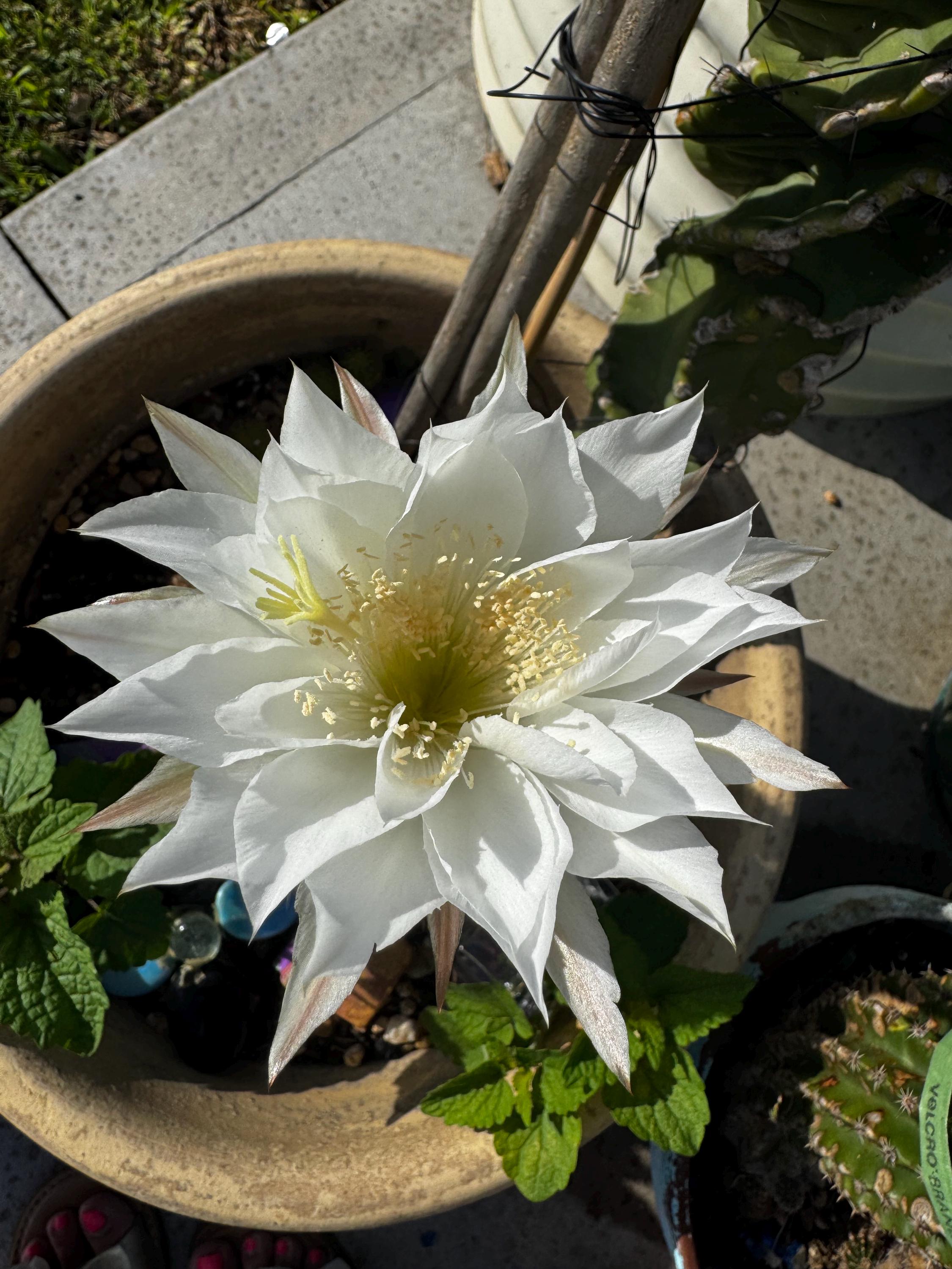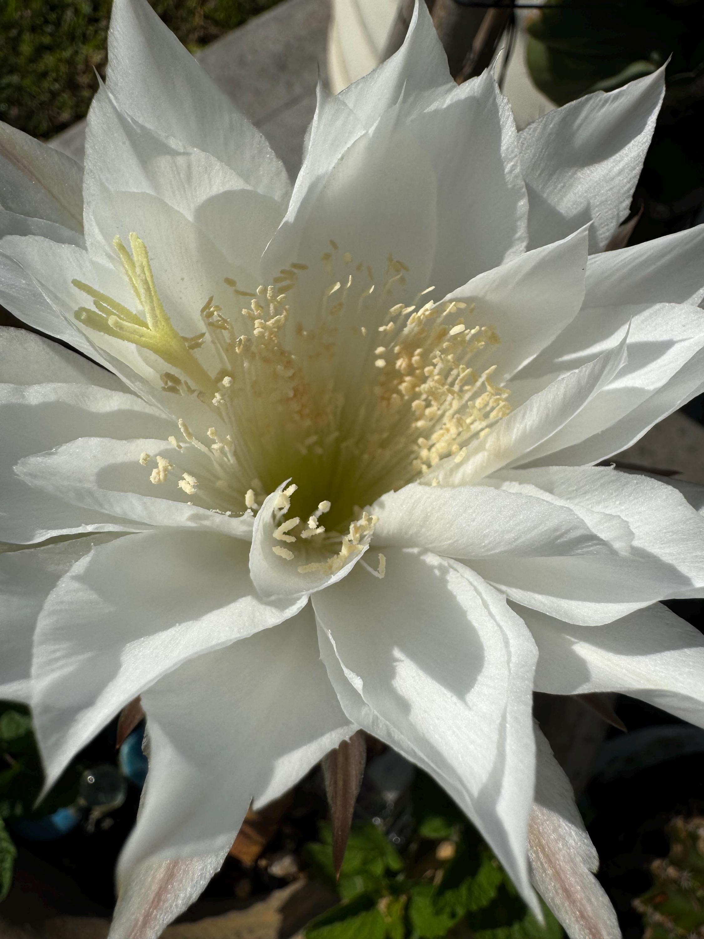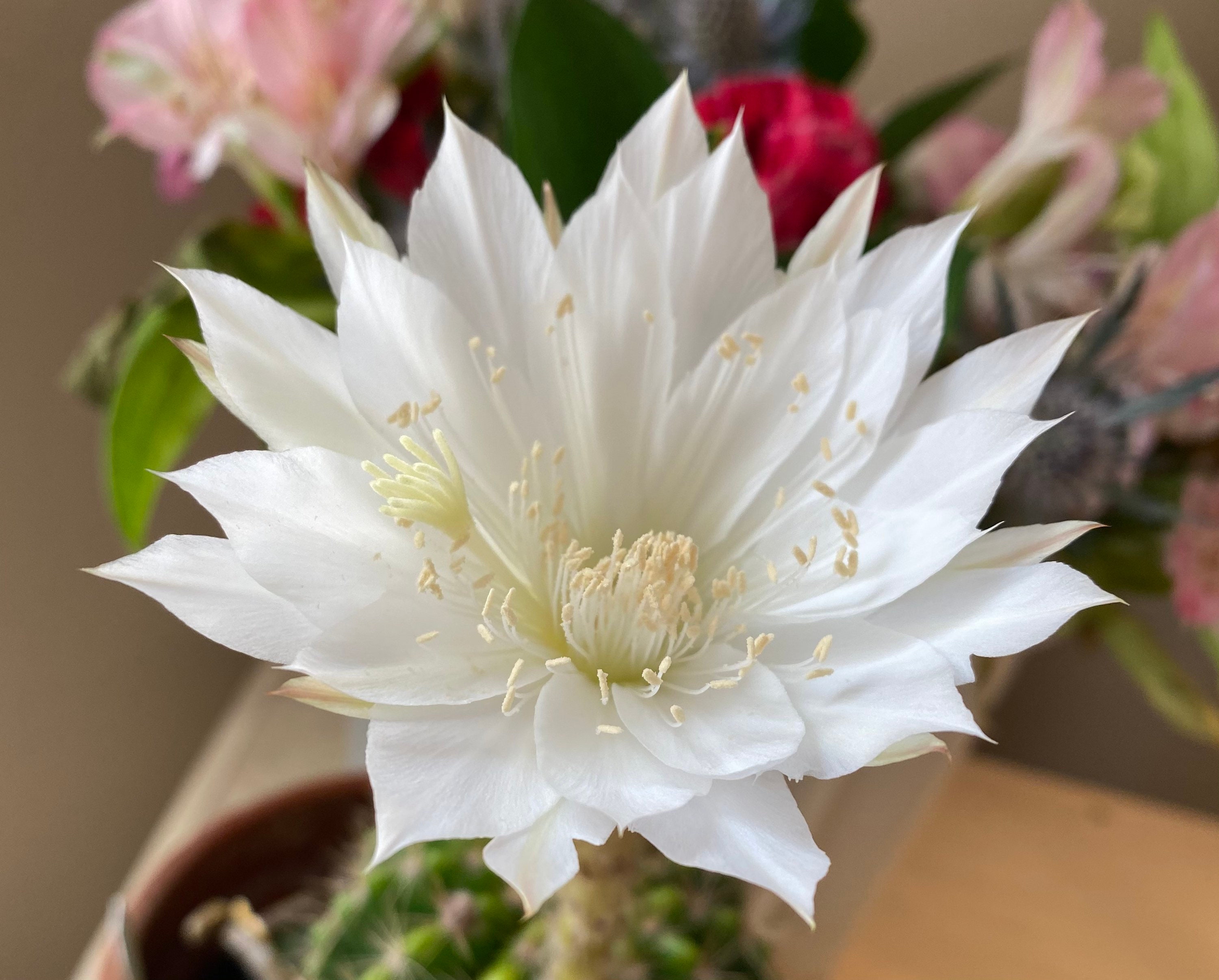 DANCING WITH NATURE IS OFFERING 2” x2” ROOTED STARTERS OF THIS BEAUTIFUL ECHINOPSIS. Beautiful, slightly fragrant white blooms. Our mother plant has bloomed bouquets for us consistently. I can just picture this one blooming at a wedding. It is a wedding type flower...so romantic and abundant! SO EASY TO CARE FOR AND SO REWARDING! ALUMINUM TAG INCLUDED.