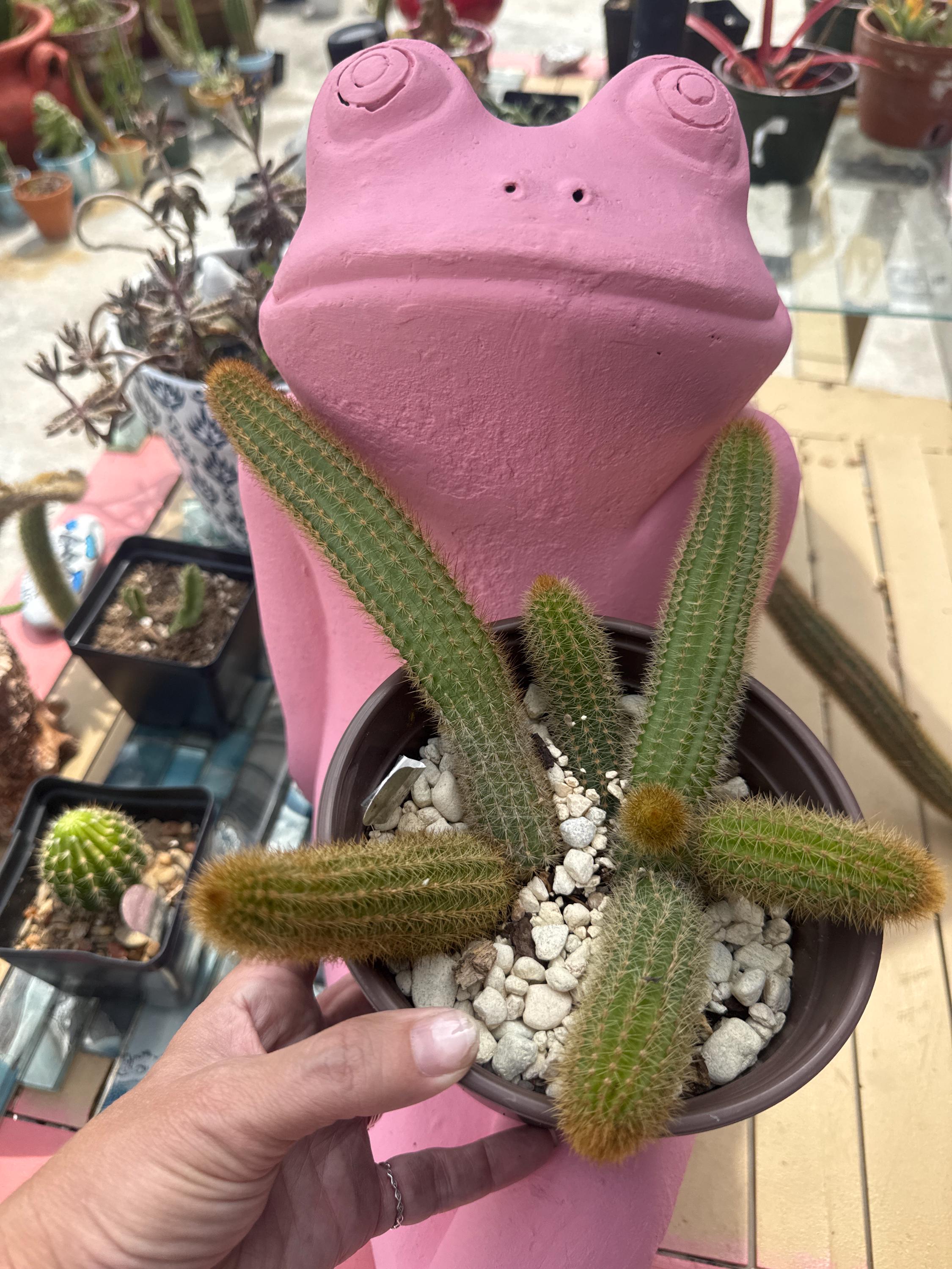 We are offering beautiful ‘Traisengluck’ Hildewintera. It has gorgeous golden spines and is ready to grow for you! Comes with its aluminum tag. Off to a great start! Hanging basket ready! Longest stem is 9.”